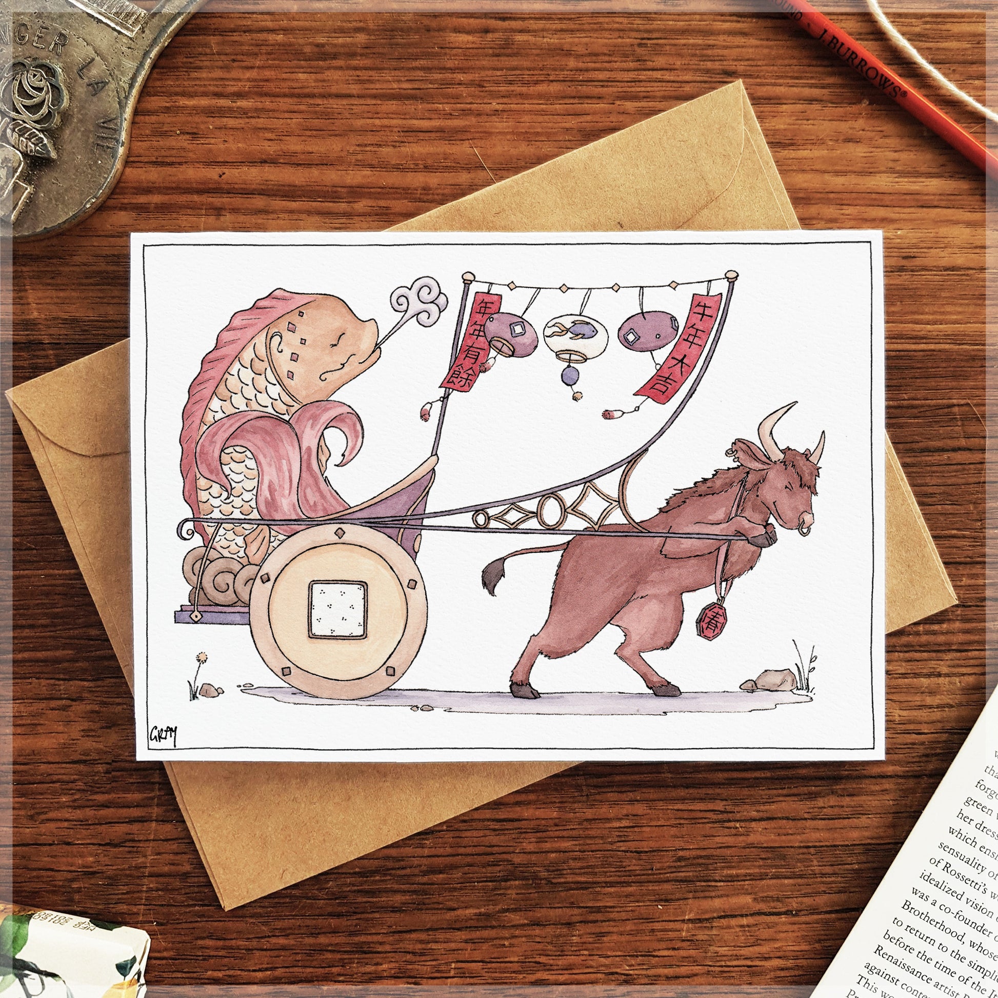 This determined Ox is on his way from his meadow workshop to the city to install his latest artwork, a magnificent statue of a fish; a tribute to the Human cultural practice of Chinese New year! This card celebrates that 2021 is the Year of the Ox!