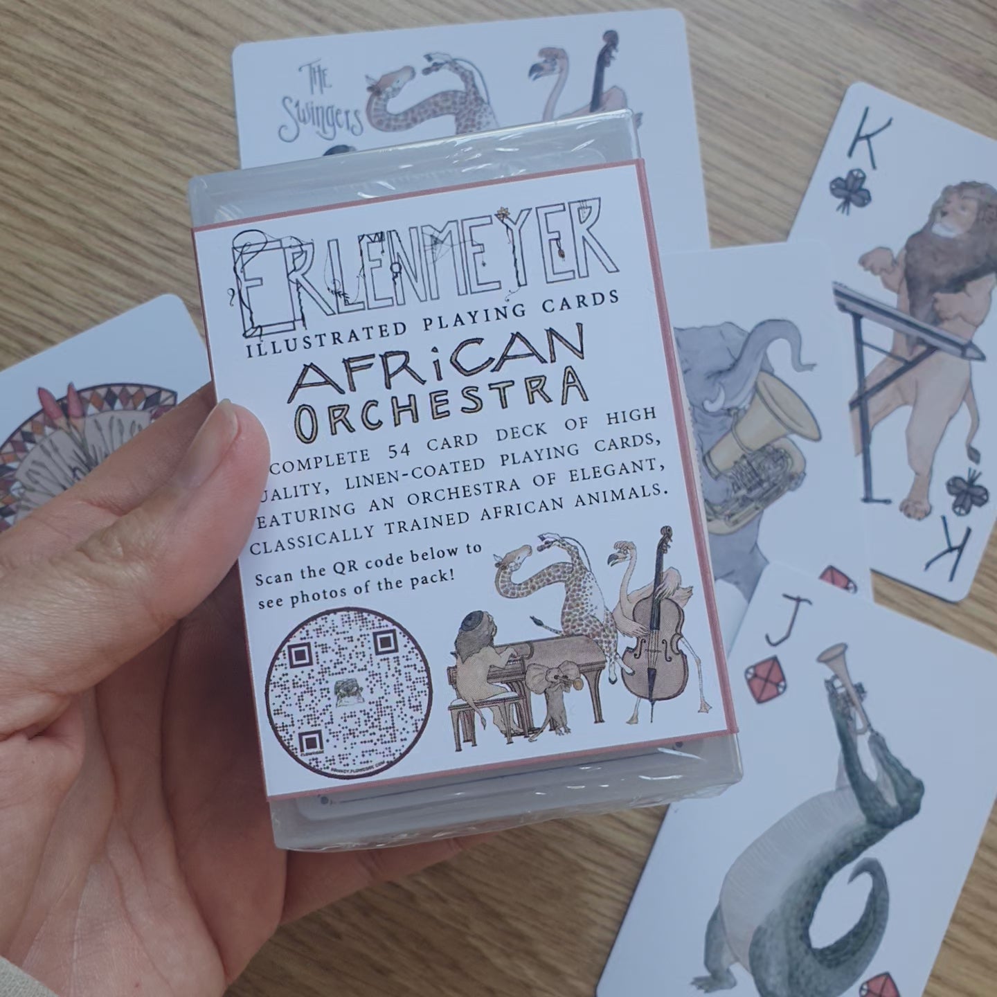 This is a 54 card deck of hand illustrated playing cards - ink and watercolour illustrations of classically trained African animals!