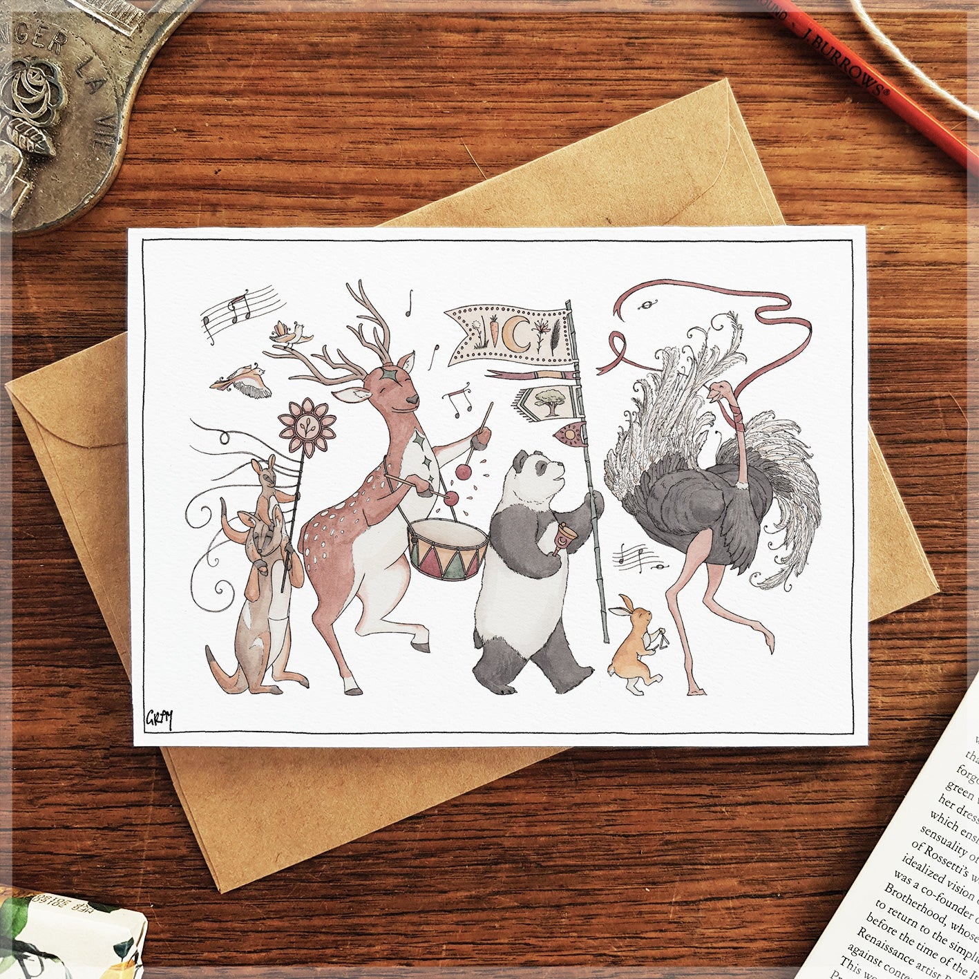 This A6 greeting card has been professionally printed on 300gsm Felt paper. It Includes a brown paper envelope and is wrapped in a plastic sleeve.