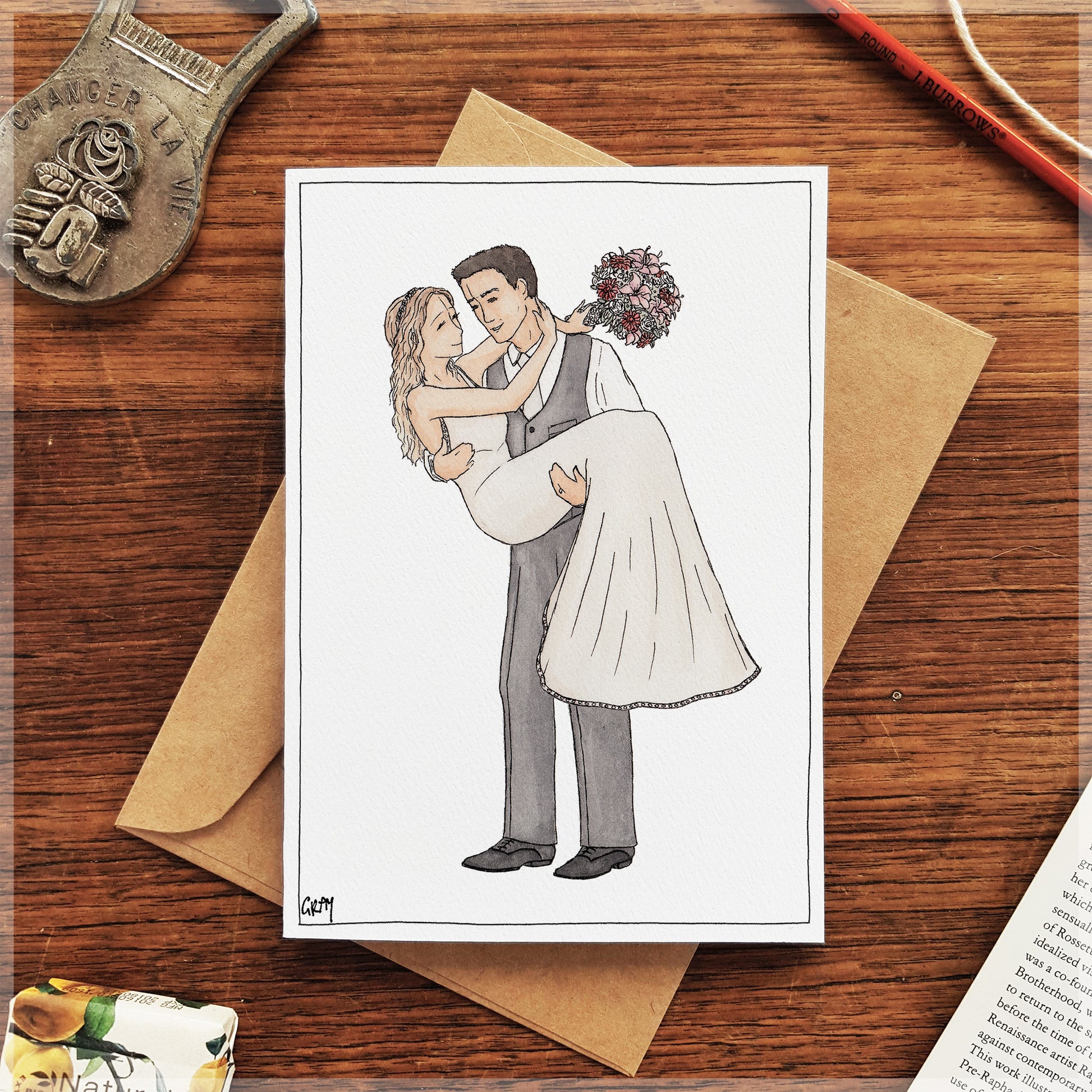 This A6 greeting card has been professionally printed on 300gsm Felt paper. It Includes a brown paper envelope and is wrapped in a plastic sleeve.