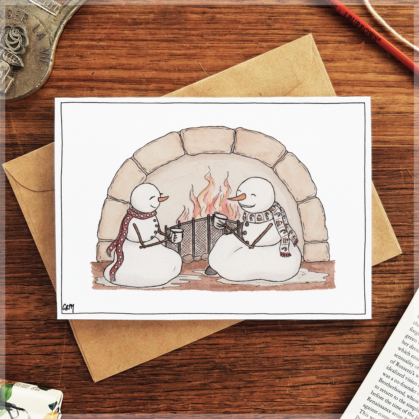 This is a Christmas card that features a romantic fire-side scene of our two favourite Snow-lovers.