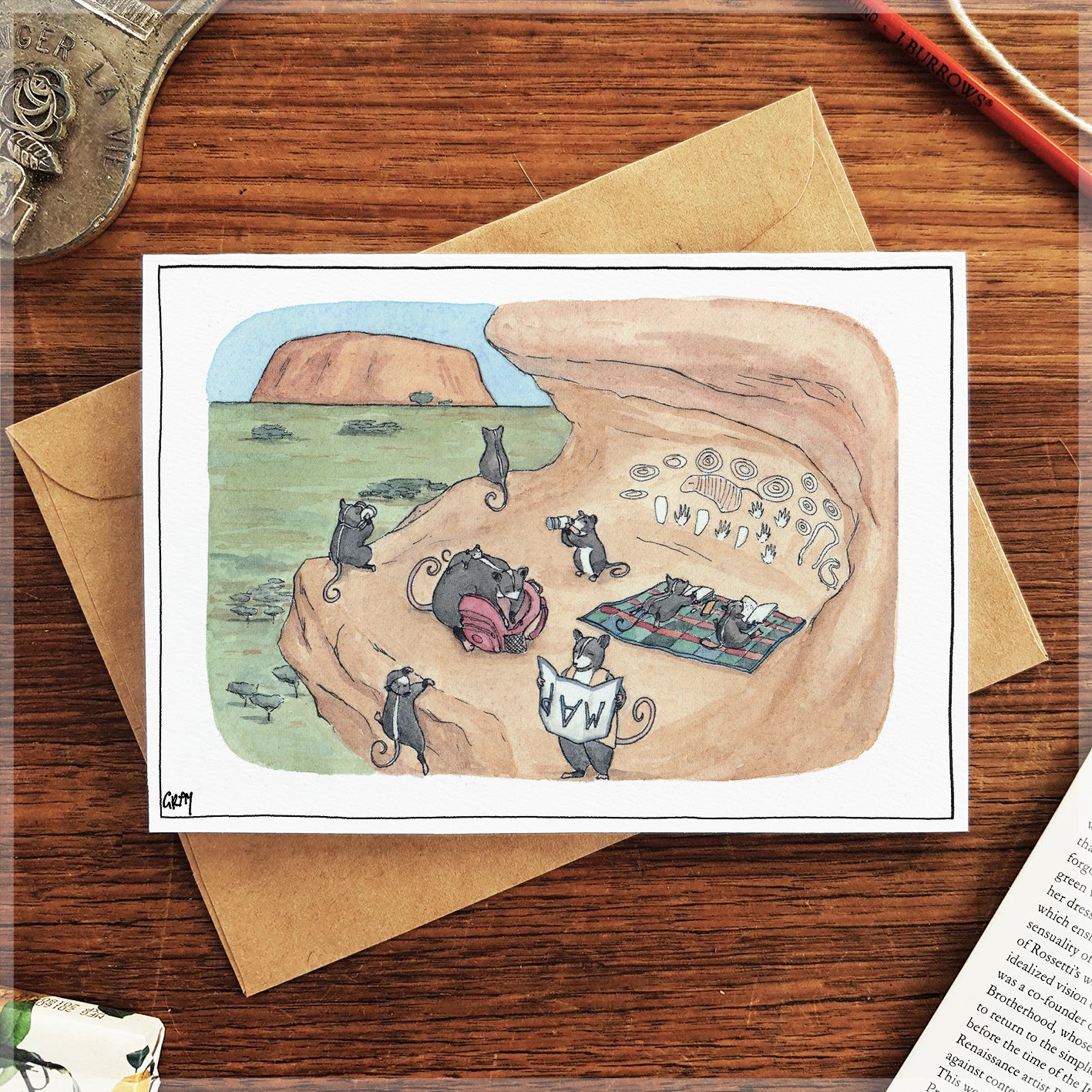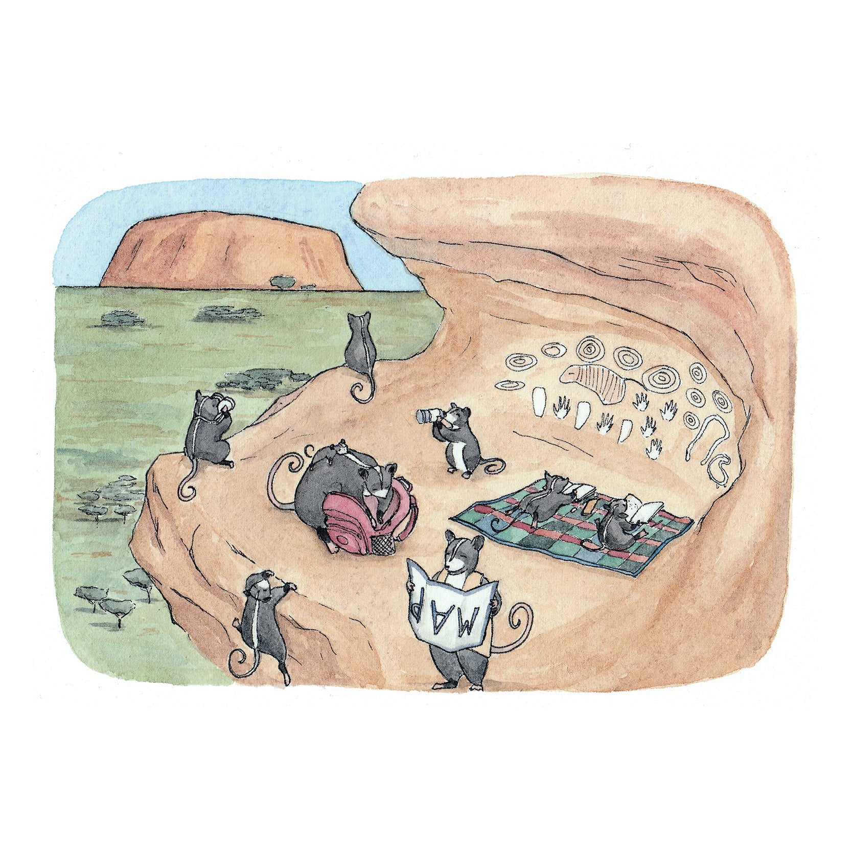 A big, happy Possum family resting near a cave painting while exploring Australia's famous Uluru-Kata Tjuta National Park.