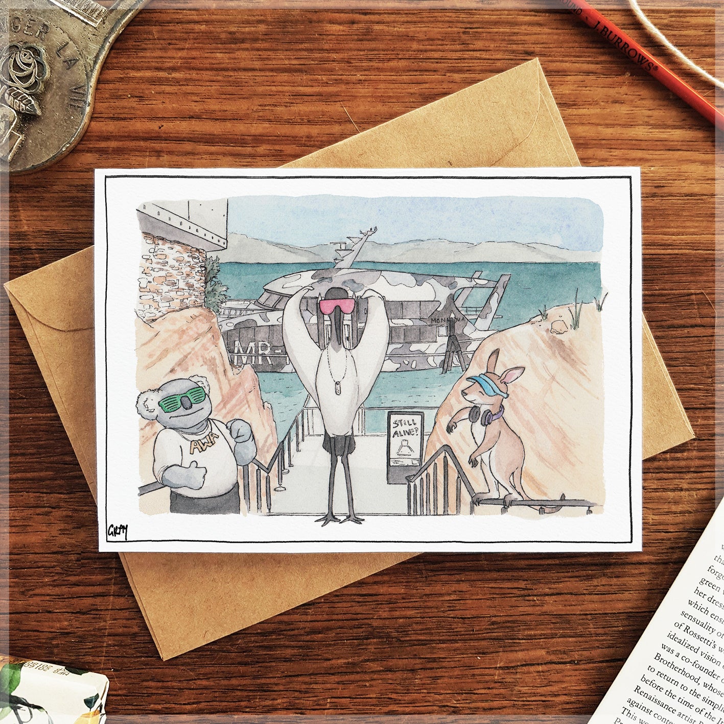 This A6 greeting card has been professionally printed on 300gsm Felt paper. It Includes a brown paper envelope and is wrapped in a plastic sleeve.