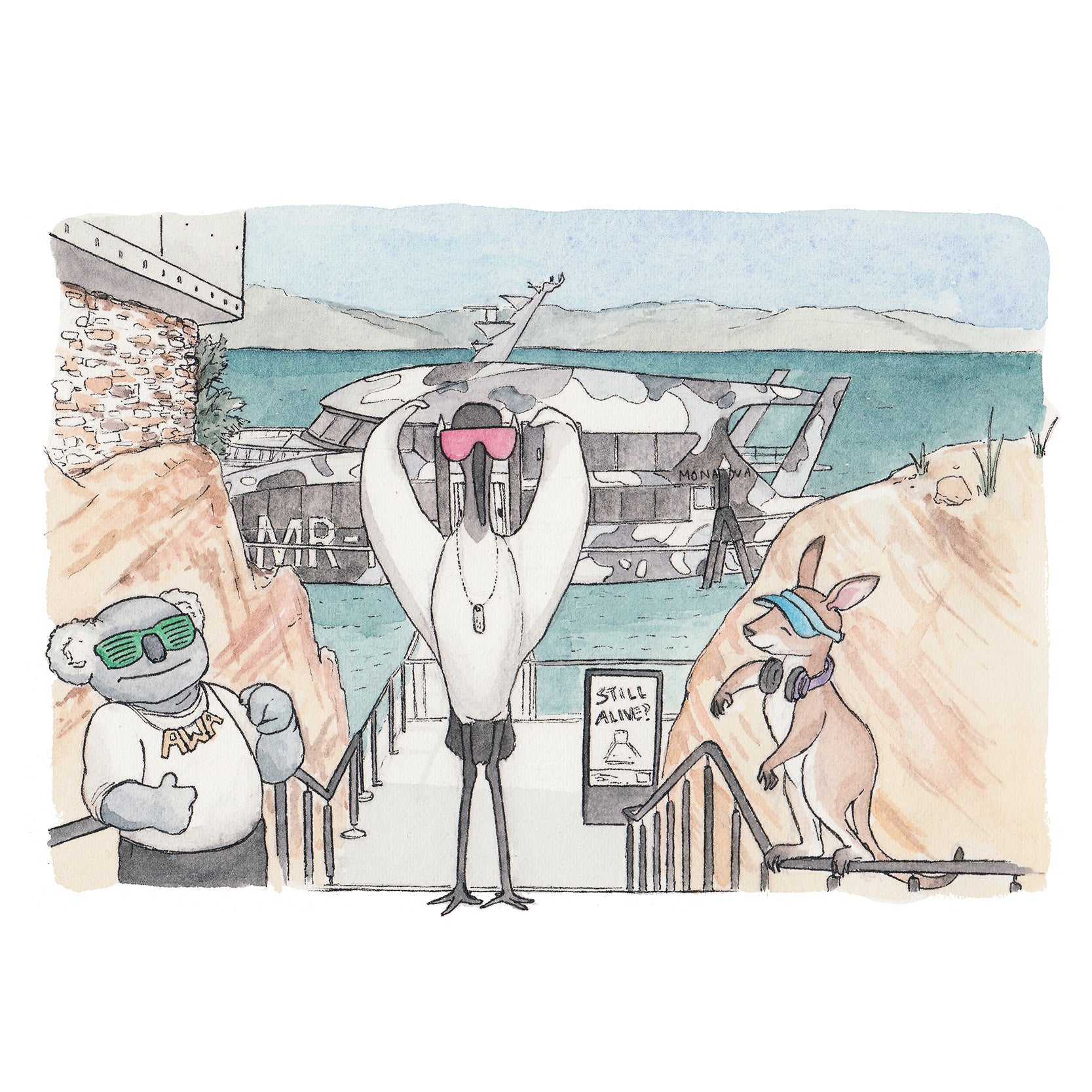 Australia's beloved hip hop band, A.W.A (Animals-With-Attitude) posing on the steps of the Museum of Old and New Art in Hobart.