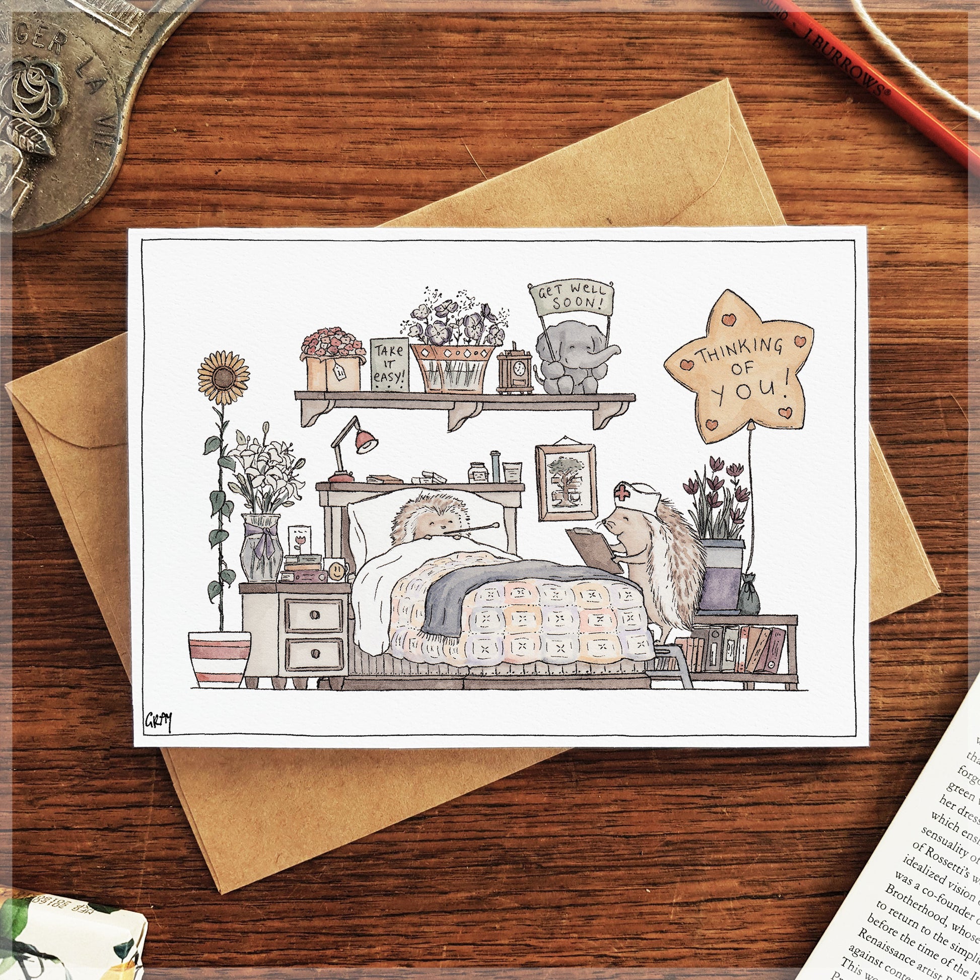 It's no fun to have to stay in bed all day, but even the most prickly patient can be softened with enough flowers and cups of tea. A perfect card to express sympathy and a swift recovery to a pal who's been under the weather.