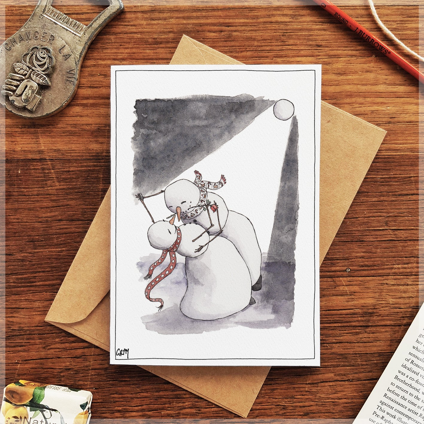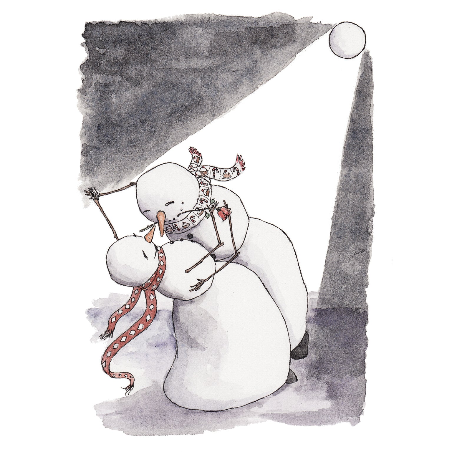 This is a Christmas card that features a dramatic scene of a playful snow-couple slow-dancing under the spotlight of the moon.