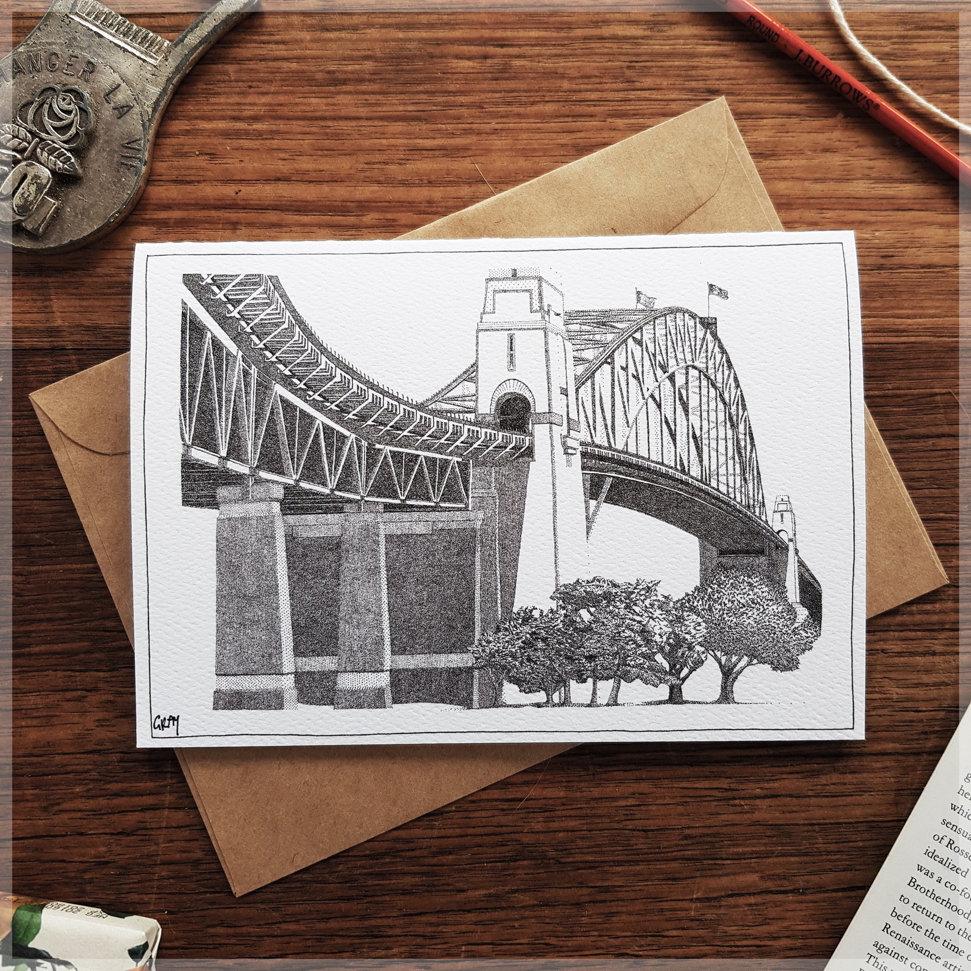 A stippled illustration of the Harbour Bridge from Kirribilli on Sydney's North Shore. (The original was a gift for Steph's step-dad when he moved overseas - he loves this view).