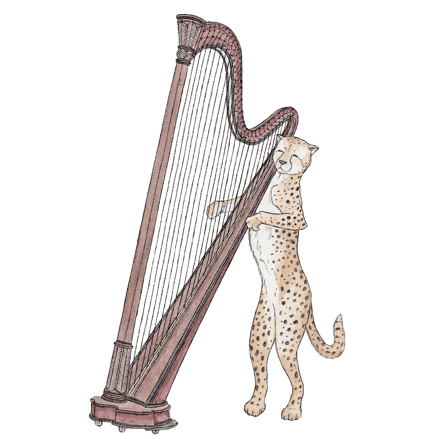 An illustration of an elegant Cheetah serenely strumming her harp.
