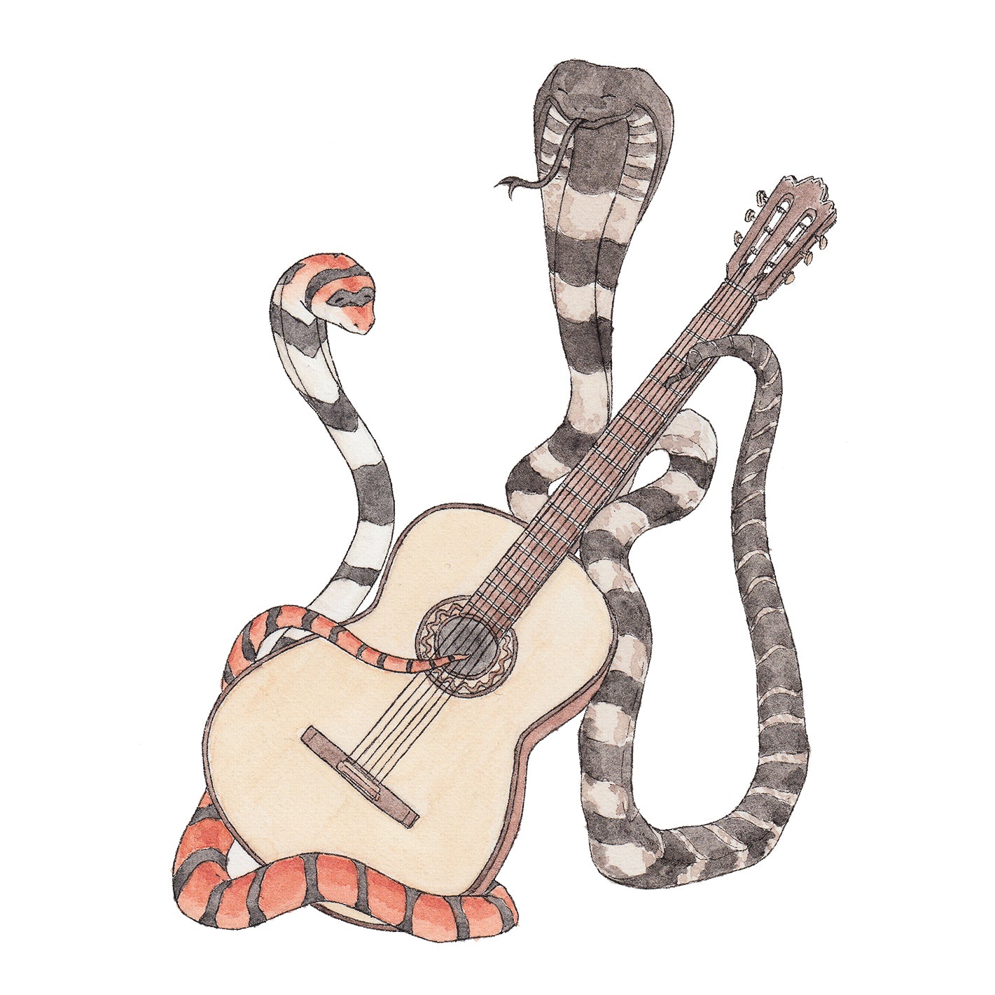 An illustration of a Cape Coral Cobra and Ring-necked Spitting Cobra happily performing as a classical guitar duet.