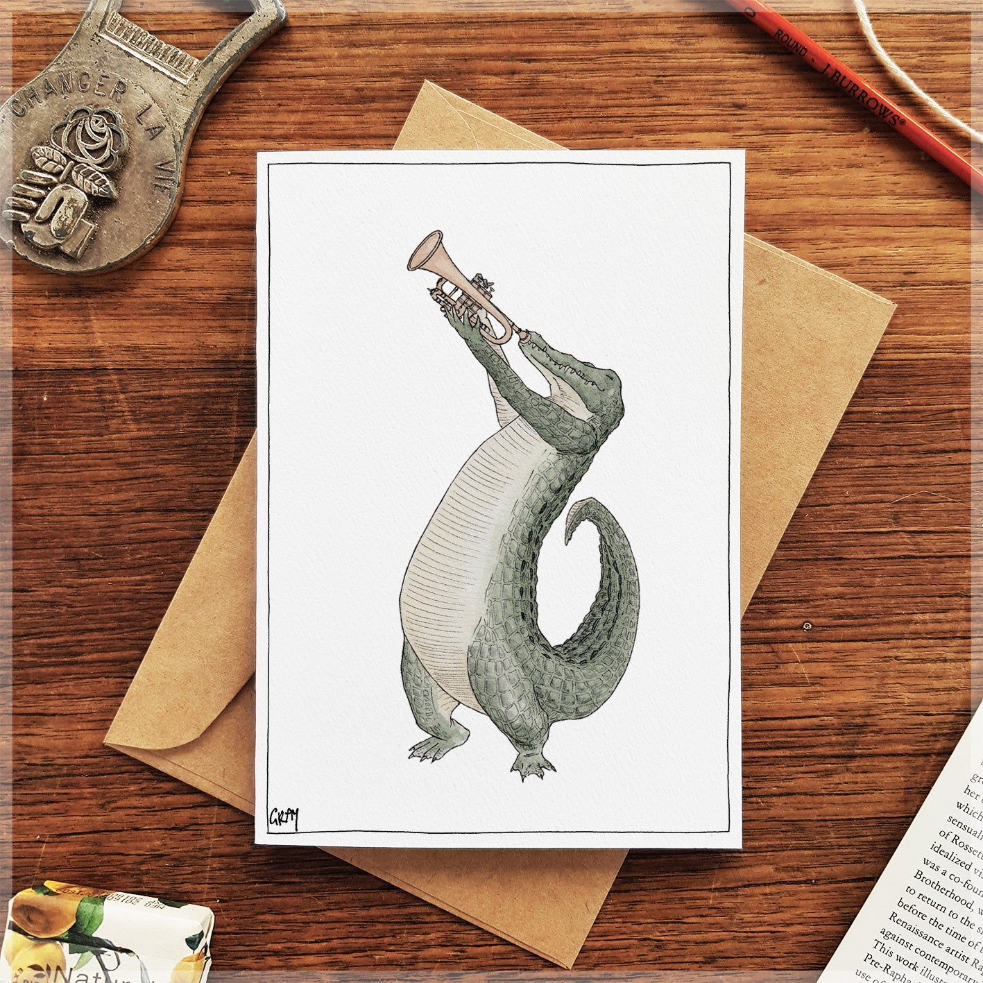 An illustration of a lively Nile Crocodile playing his trumpet.