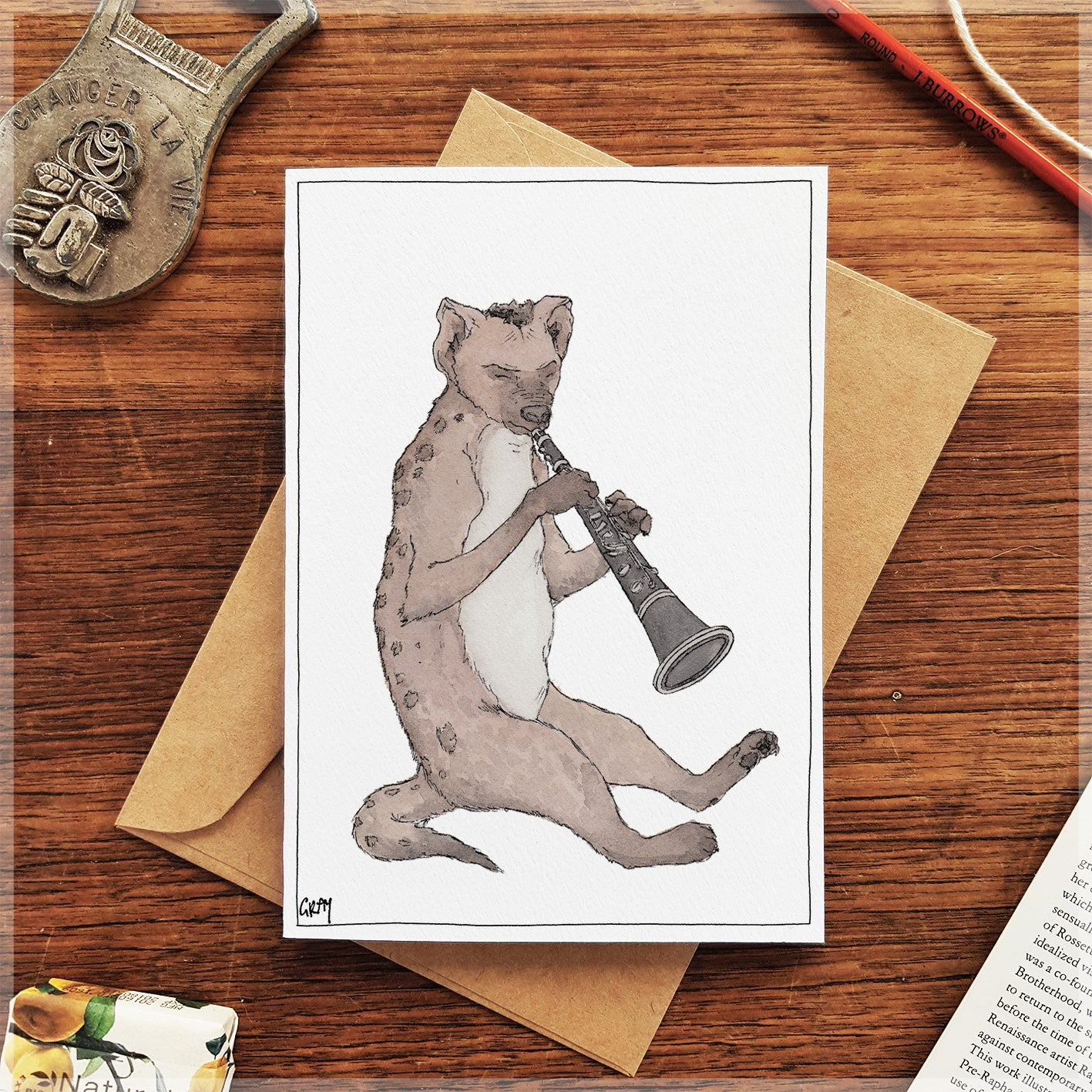 An illustration of a happy little Spotted Hyena working very hard on his clarinet.