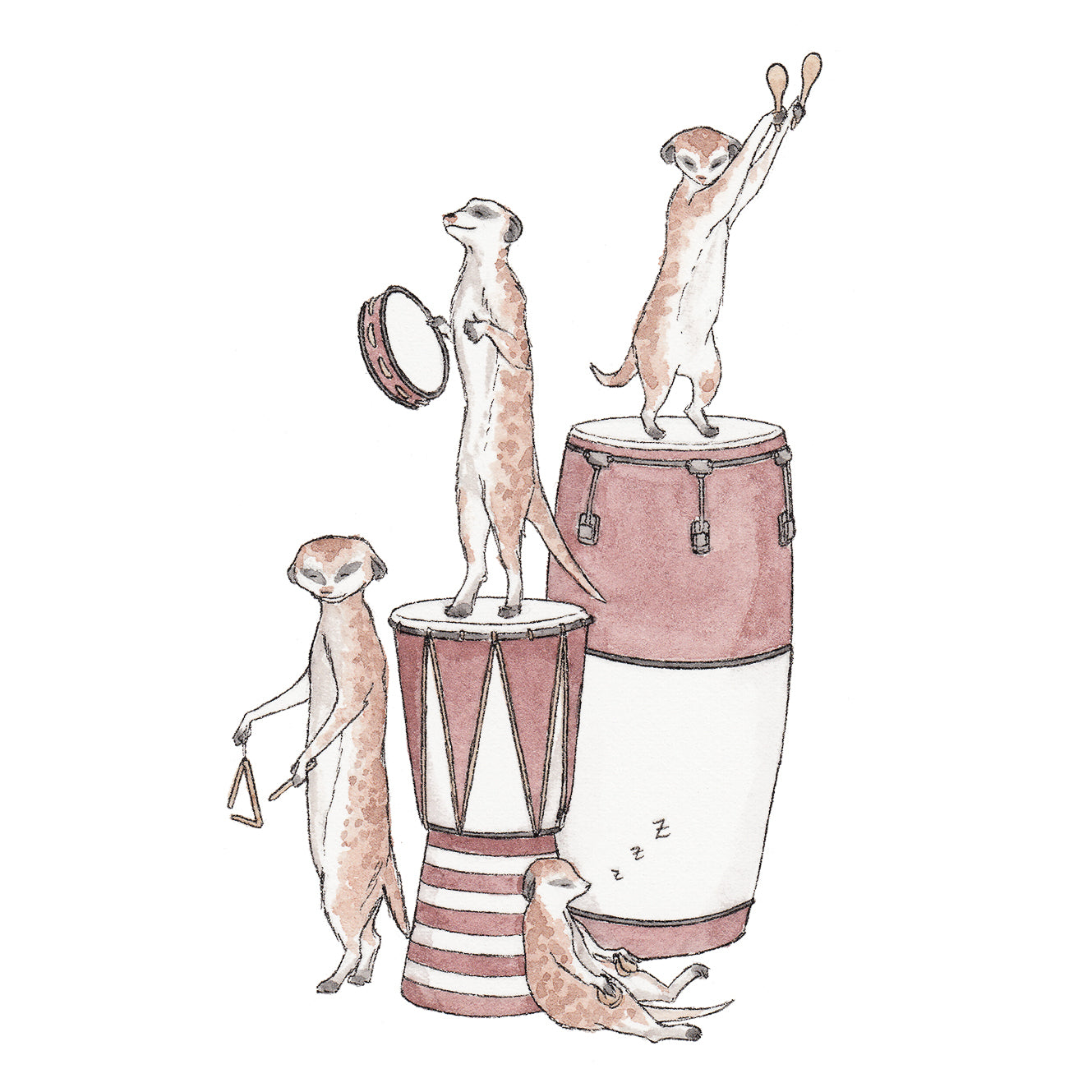 An illustration of a cheeky clan of Meerkats sharing their love of percussion.