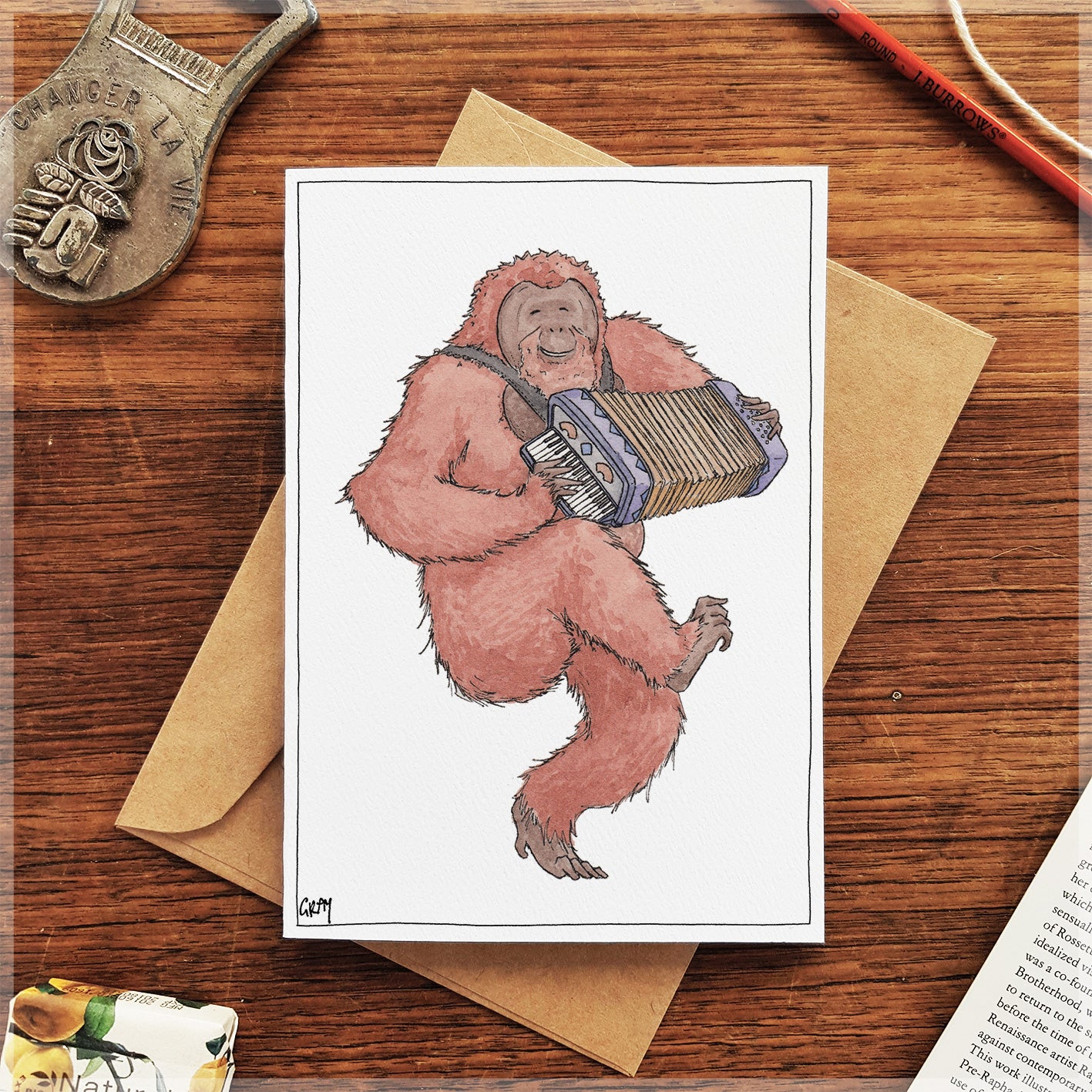 An illustration of an dextrous orangutan playing his accordion.