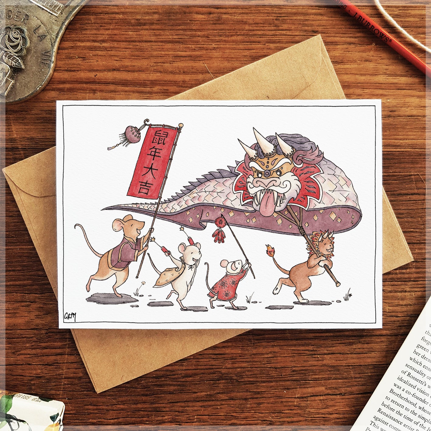 Some little Erlenmeyer creatures tell the story of the Monster Nian, who can be scared away by loud noises and bright colours. This card also celebrates the New Year - 2020 is the Year of the Rat!